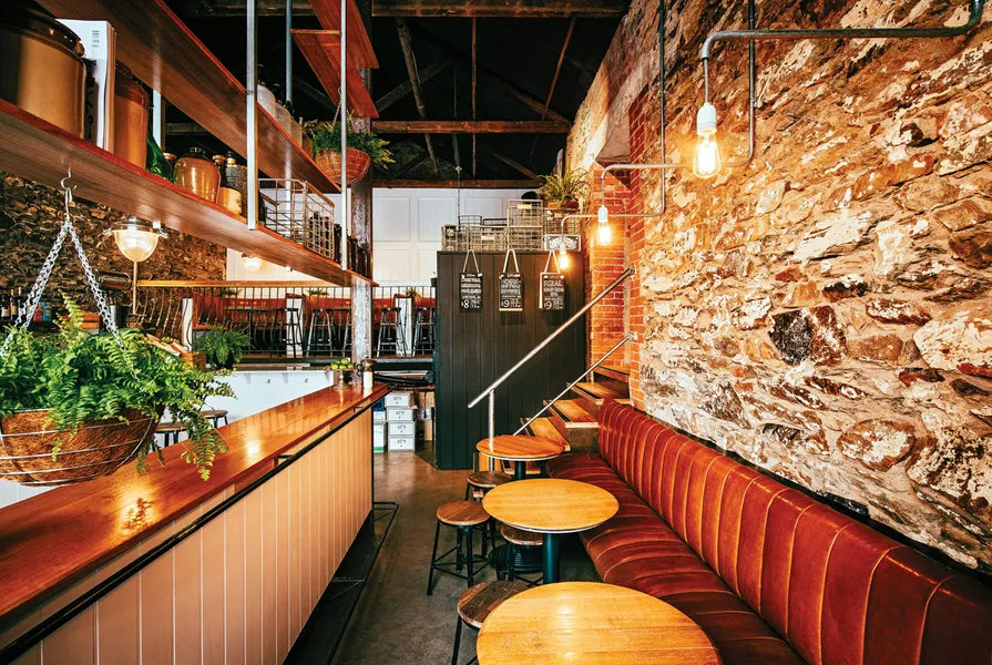 Best Bar Design | Adam Johnson of Xtra Shiny - Eat Drink Design Awards 2014. Pictured: Custom banquet upholstery using Contemporary Leathers ‘Verona’ in the shade ‘Nutmeg’ by Luke Makris of Beilby’s Furniture.